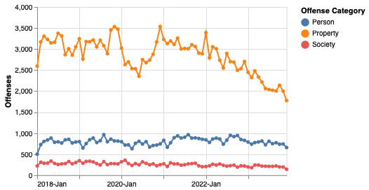 The key feature of NIBRS is they pay attention to incidents versus specific offenses. For example, last August, when Hiram Silva killed three women at his neighbor’s house, and then the neighbor shot and killed him in self-defense, there were four homicides, but one incident. When tracking crime counts, it can be tricky to figure out if crime spiked in a given month in the sense we usually think about—a lot of different somewhat independent incidents—or if there was a major episode that included multiple victims and multiple crimes, and thus shows up in our data as a lot of crimes.